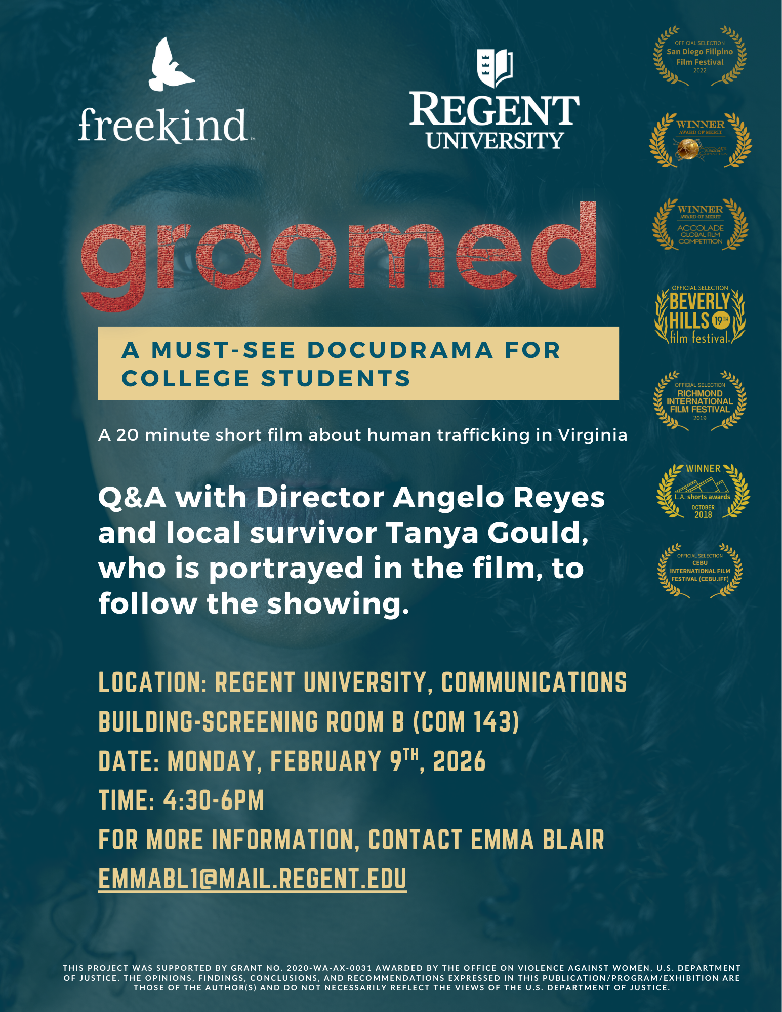 Back to All Events Groomed Showing at Regent University Monday, February 9, 2026 4:30 PM 6:00 PM Regent University 1000 Regent University Dr, Virginia Beach, VA 23464 Communications Building- Screening Room B (COM 143) (map) Google Calendar ICS