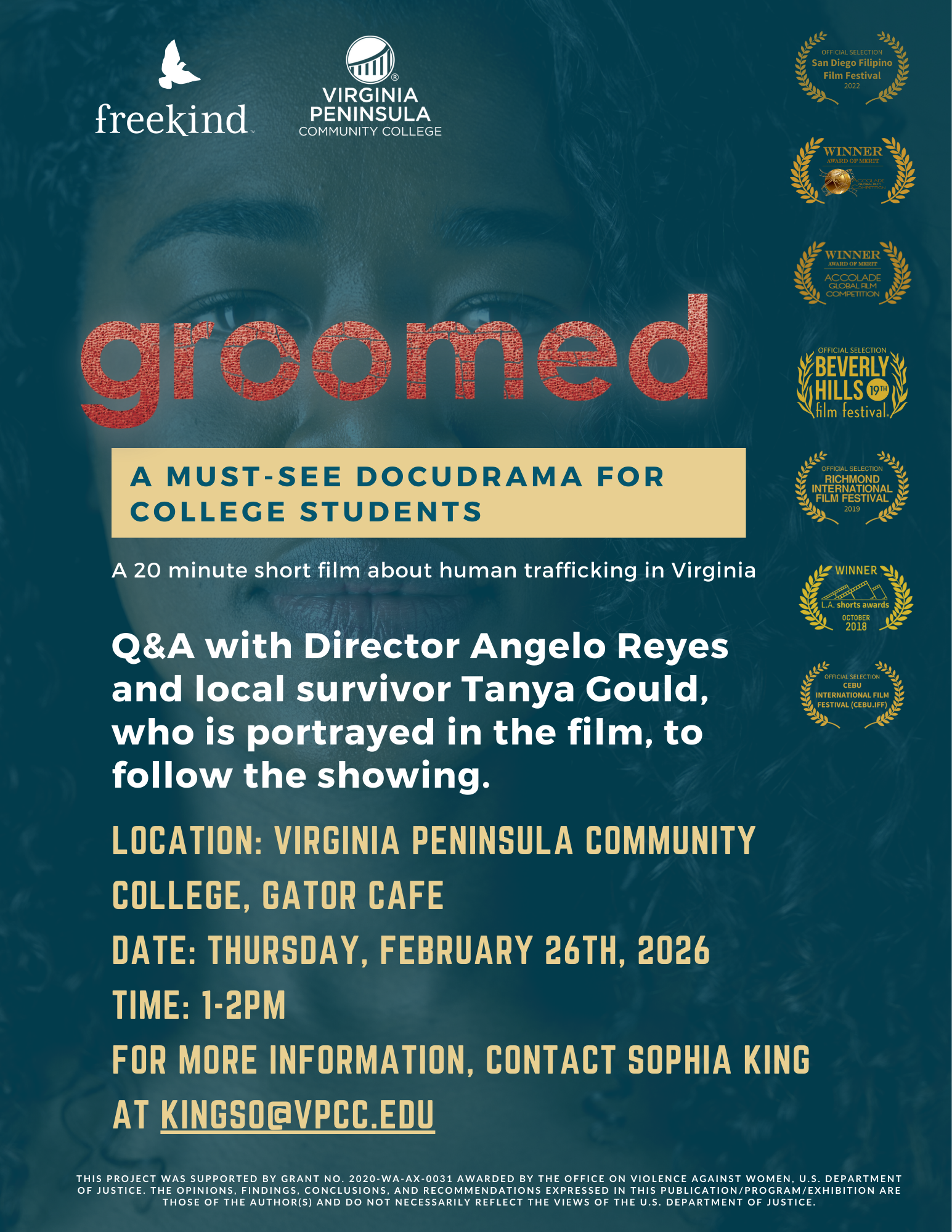 Groomed Showing at Virginia Peninsula Community College - Hampton Campus Thursday, February 26, 2026 1:00 PM 2:00 PM Virginia Peninsula Community College 99 Thomas Nelson Drive Hampton, VA, 23666 Gator Cafe (map) Google Calendar ICS